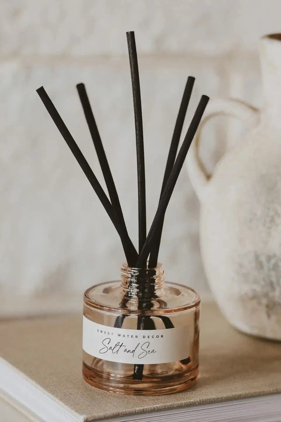 Salt + Sea - Be transported to the beach with our best-selling scent Salt and Sea, now in a sophisticated tinted glass jar. This reed diffuser seamlessly blends in with Spring Decor and Summer Decor, making it a staple in any home or shop. Celebrate Summer with elevated home decor. SCENT NOTES: • Top: Sea Salt, Citrus • Middle: Musk • Base: Amber
