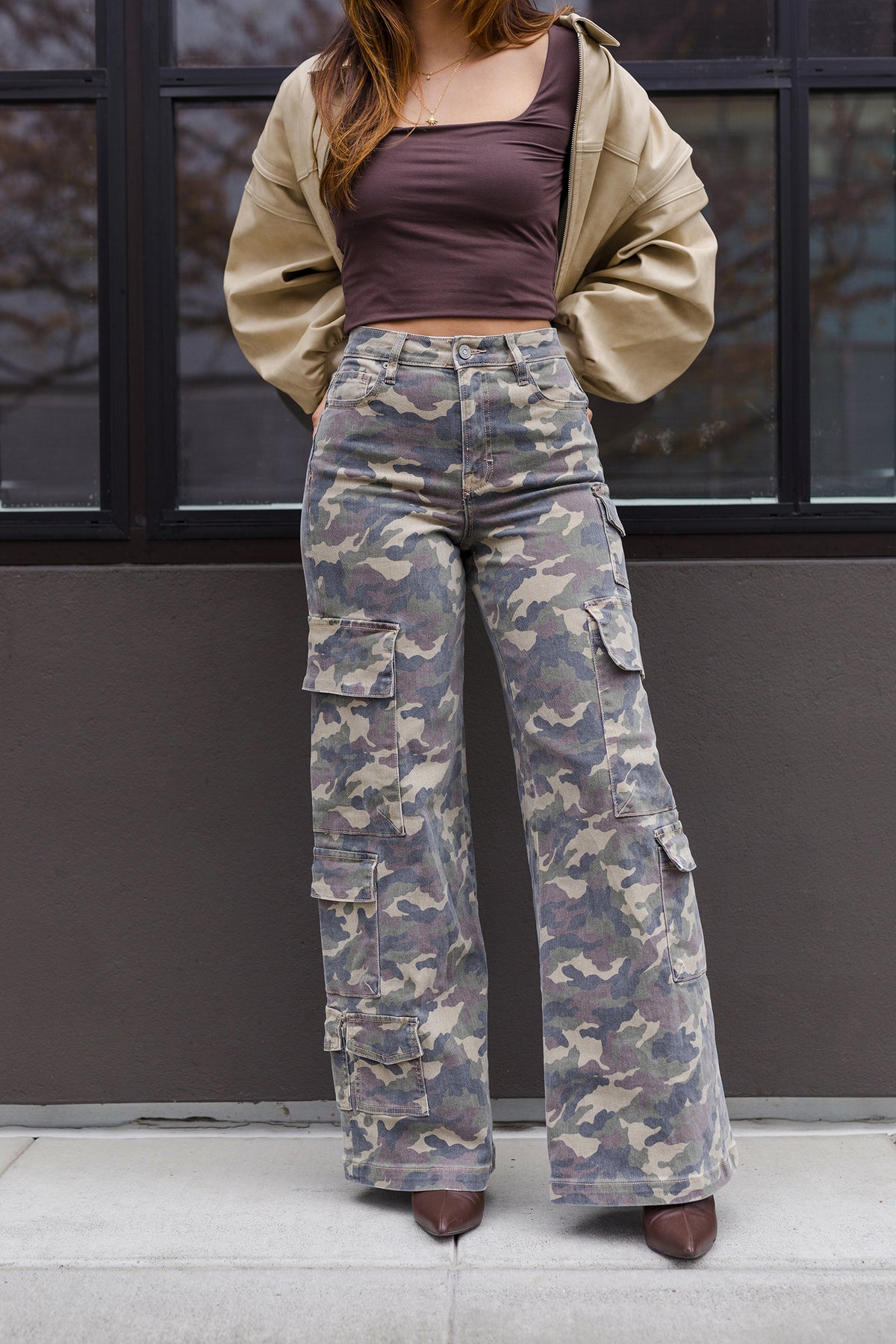 Stand out while keeping it effortlessly cool in The Attention Grabber Camo Wide Leg Jeans by Hidden. These high-rise cargo jeans feature a statement camo print, relaxed wide-leg silhouette, and functional pockets for a utilitarian edge. Crafted with a touch of stretch for all-day comfort, they bring that perfect mix of bold style and laid-back confidence.