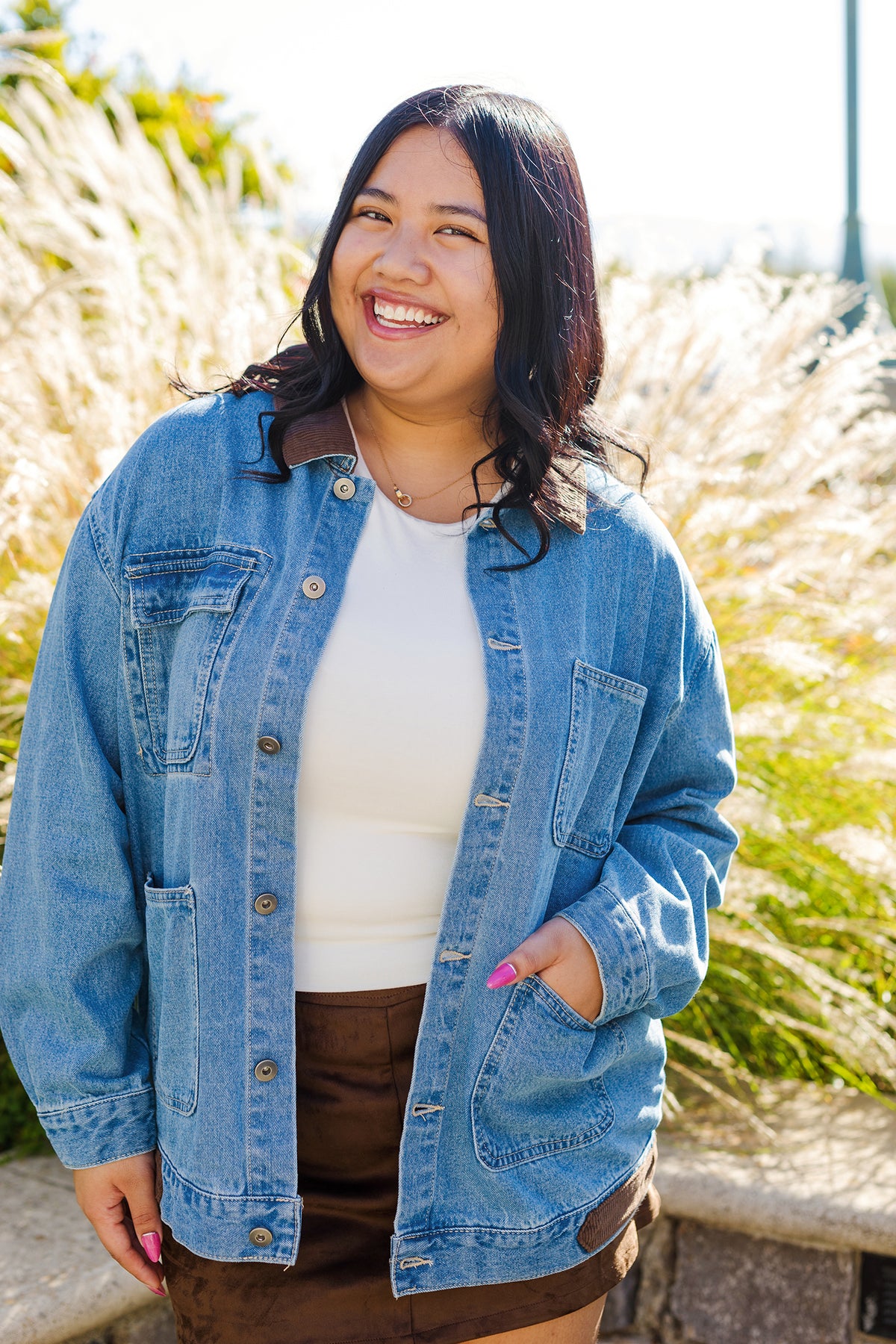 Classic with a cool-girl twist 💙 The Jocelyn Denim Barn Jacket is the perfect layering piece, designed in a timeless medium wash with a contrasting brown collar for that elevated, borrowed-from-the-barn vibe. Its long sleeves and structured fit make it versatile enough to throw over dresses, tees, or knits—basically, the jacket that works with everything.