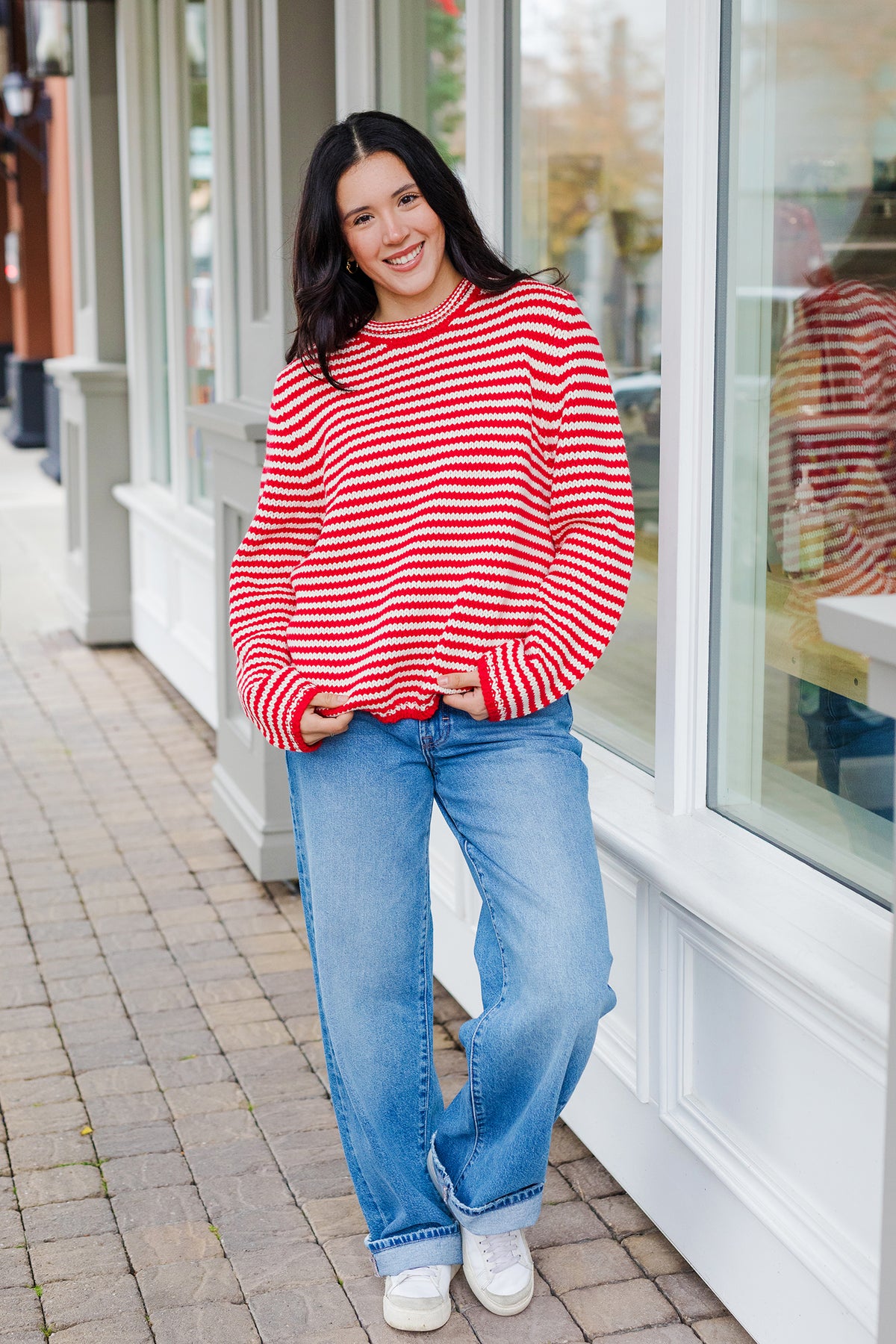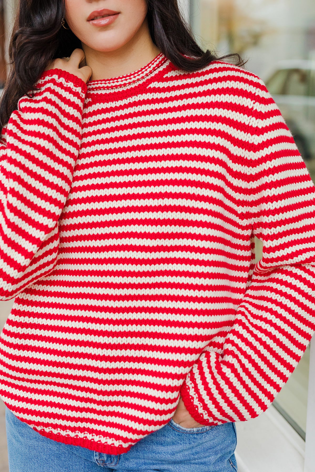 Fresh, coastal, and irresistibly comfy — The Everyday Rollneck Cozy Stripe Knit Sweater is your go-to for effortless style and all-day comfort. Designed with red and white stripes, this medium-weight knit brings a playful pop of color with a relaxed, slightly oversized fit. The drop-shoulder design and extended sleeves add that perfect slouchy, lived-in feel, while the ribbed rollneck and cuffs keep it timeless and polished.