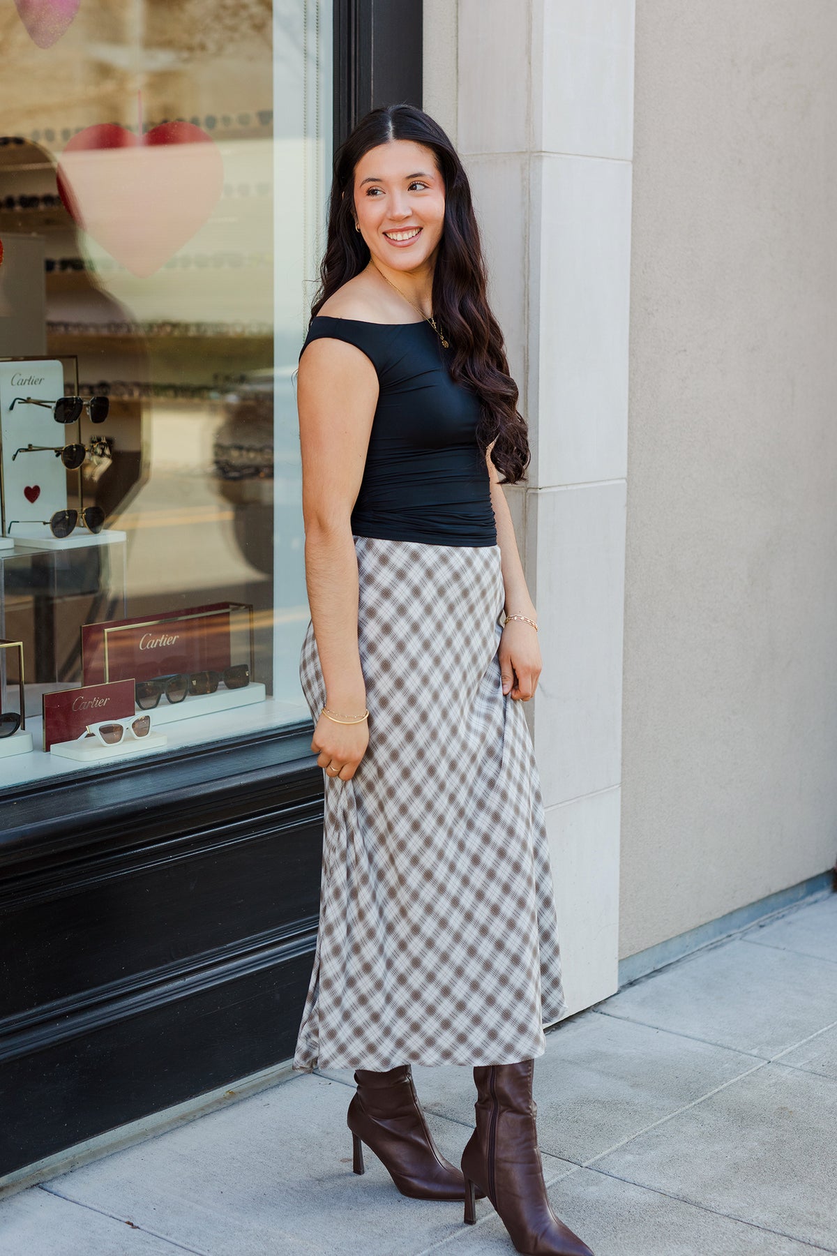 Tags: plaid midi skirt, brown plaid skirt, fall outfit, high waist skirt, A-line skirt, chocolate plaid skirt, preppy fall style, Shoppe Twelve skirt