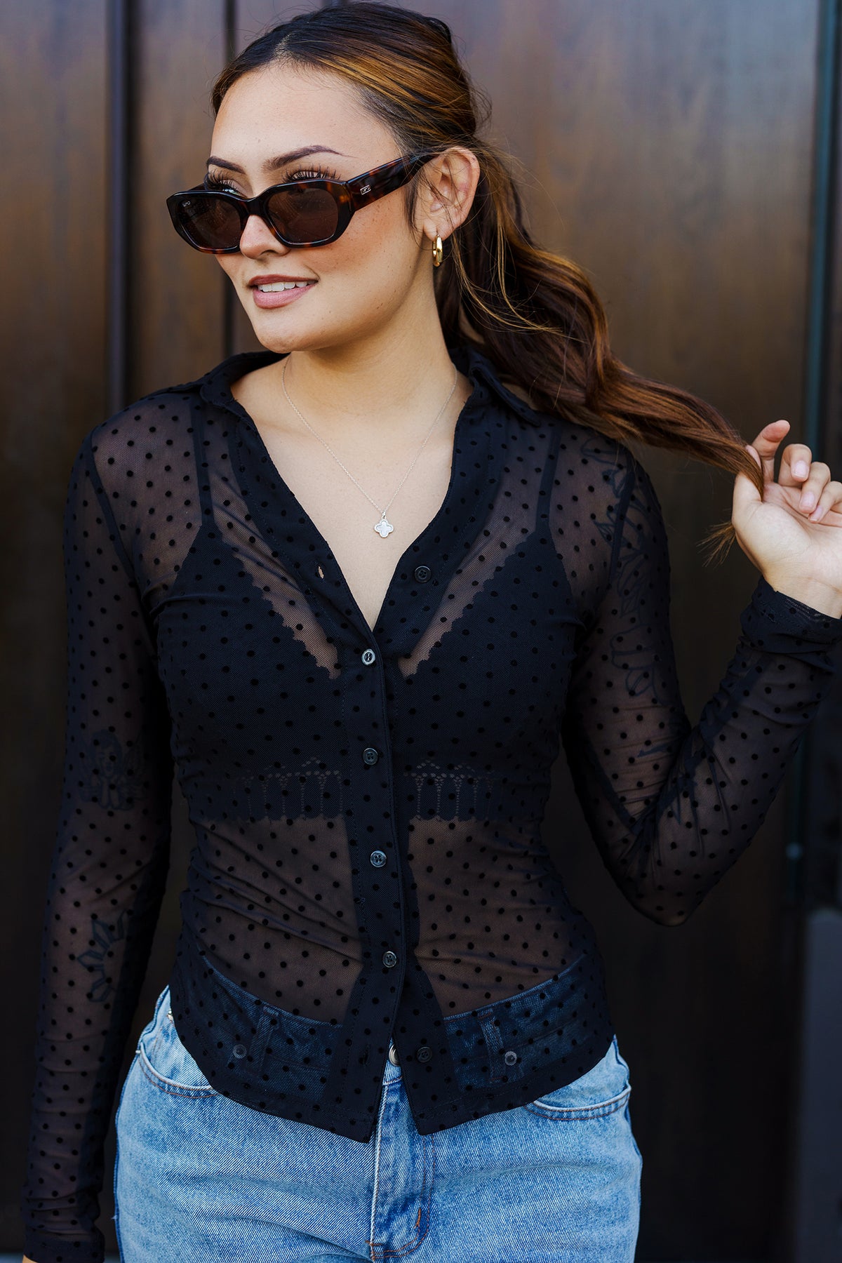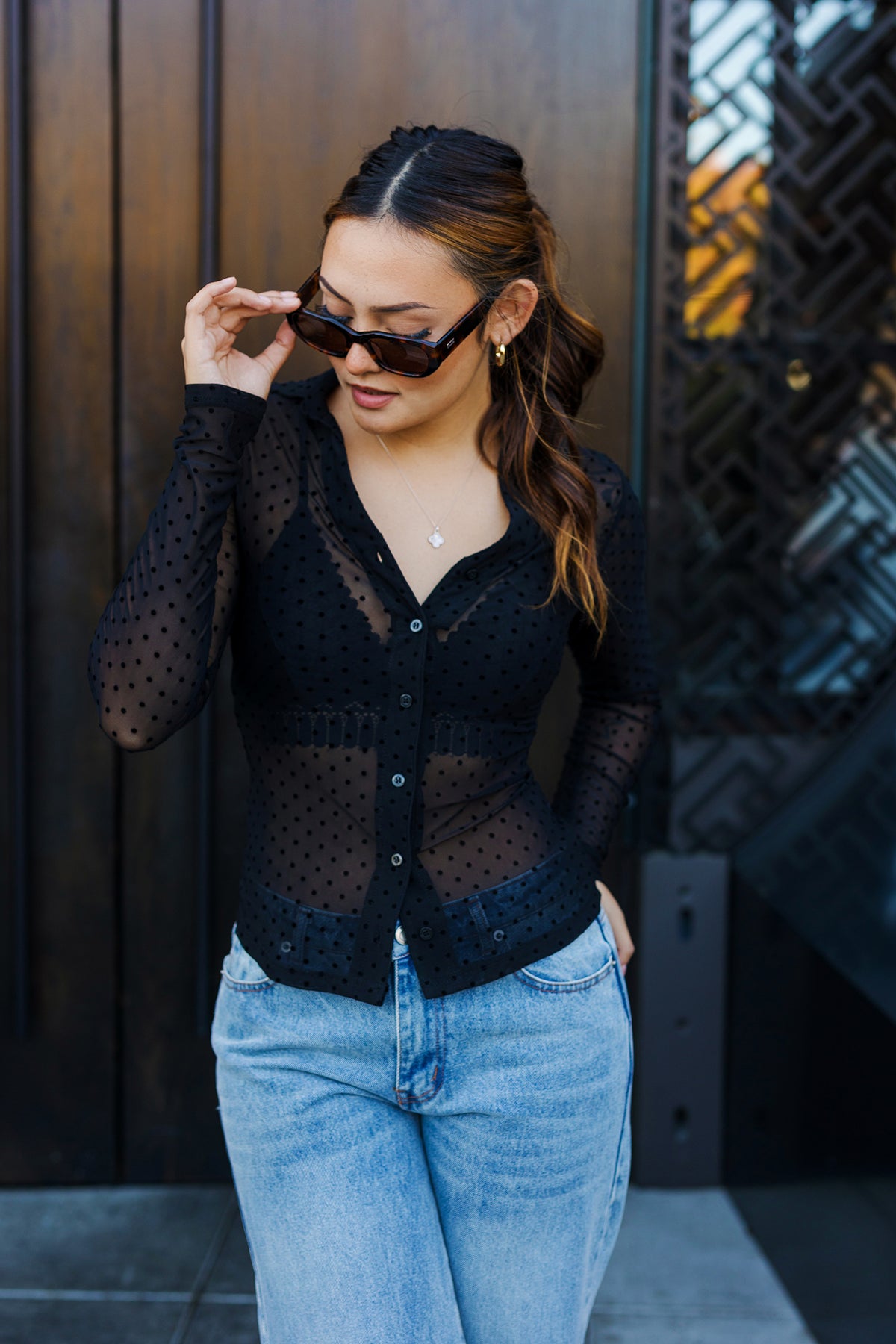 Bring a little mystery and a lot of style with The Midnight Dot Mesh Long Sleeve Top. This sheer black button-front blouse features a subtle polka dot pattern that adds the perfect touch of flirty texture. Lightweight, stretchy, and totally chic — it’s the ultimate piece for layering or styling up your next night-out look.