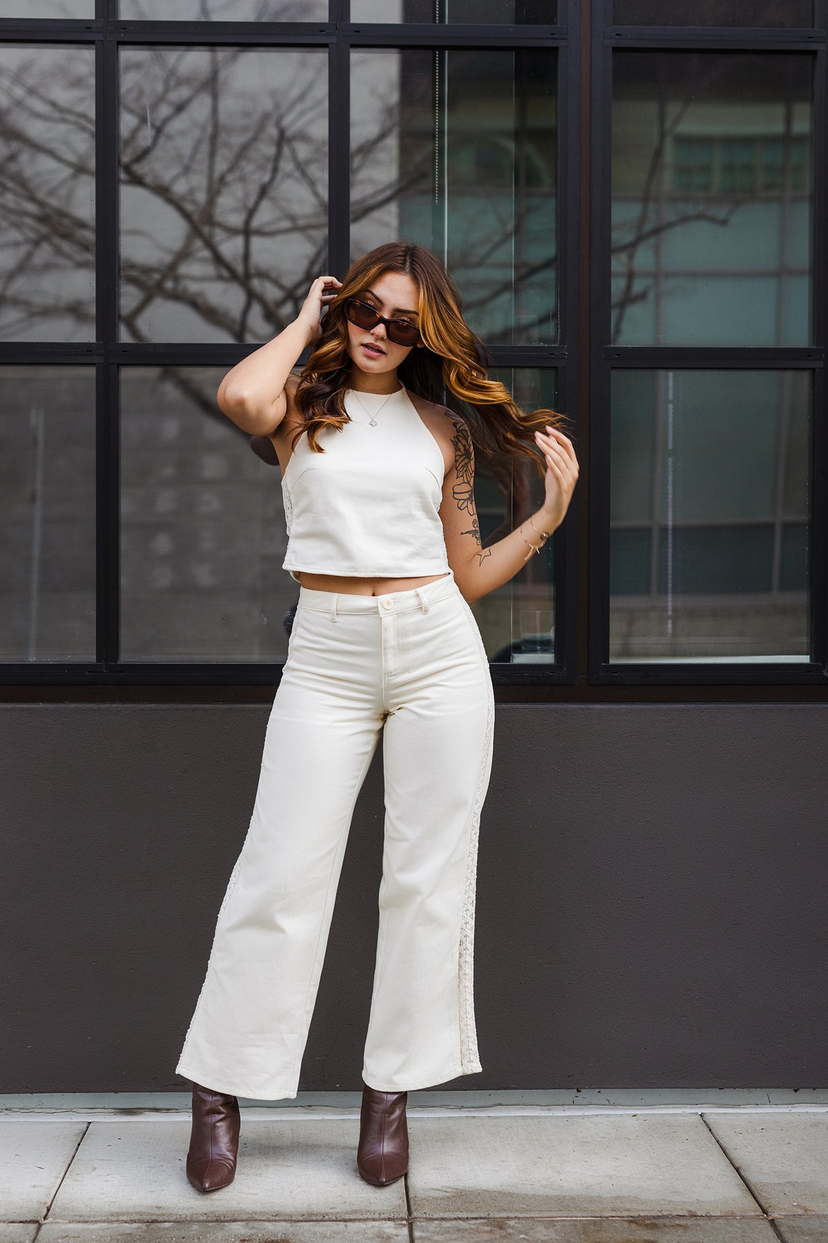 The Lace is the Point Wide Leg Pants are what happens when denim gets a little dressed up and a lot more interesting. Made from 100% cotton denim with a mid-rise fit and wide-leg silhouette, these pants stand out thanks to the lace trim running down each side—because yes, the lace is the point.