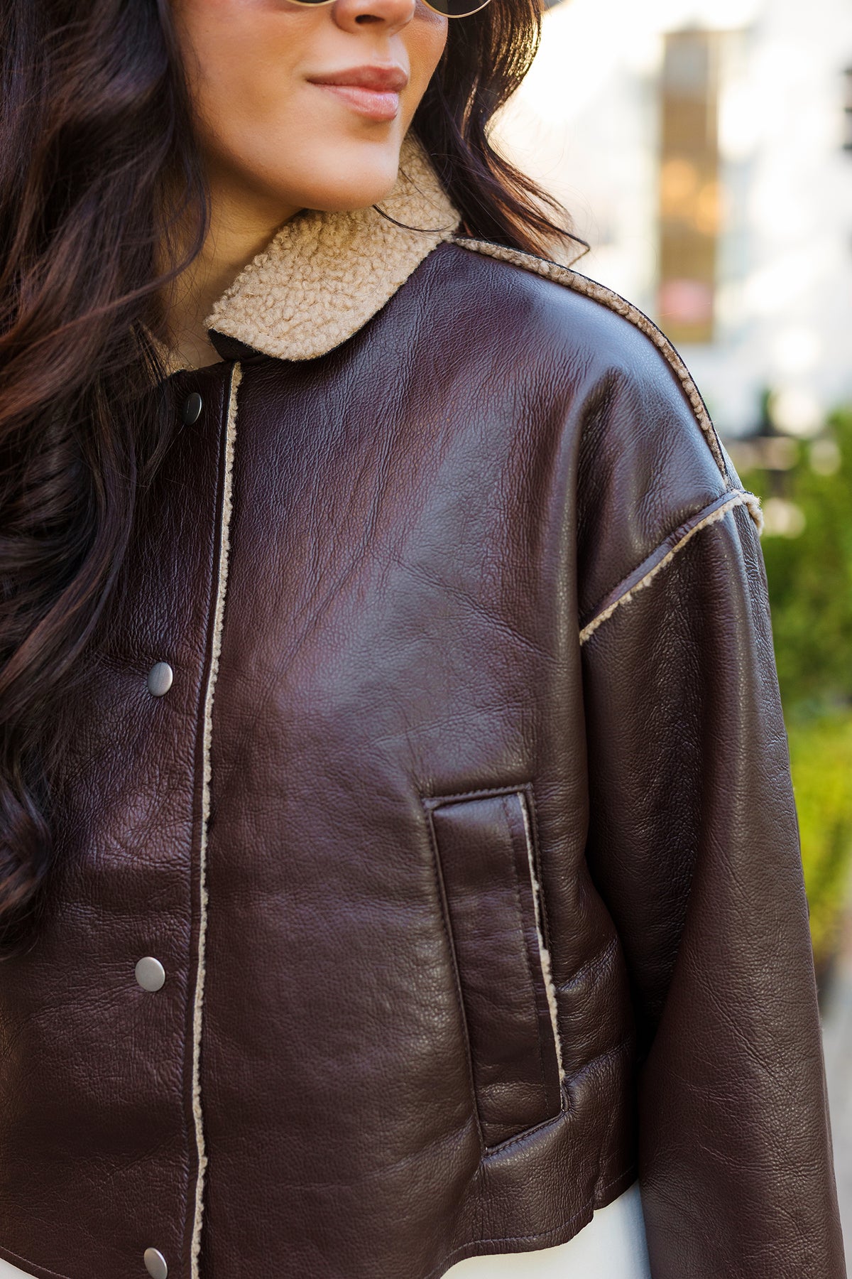 The Toffee Break Faux Leather Jacket is equal parts cozy and cool, crafted in buttery faux leather for a luxe vibe without the guilt. Its boxy silhouette and plush sherpa collar bring just the right dose of texture, while the snap front closure and side pockets keep things practical.