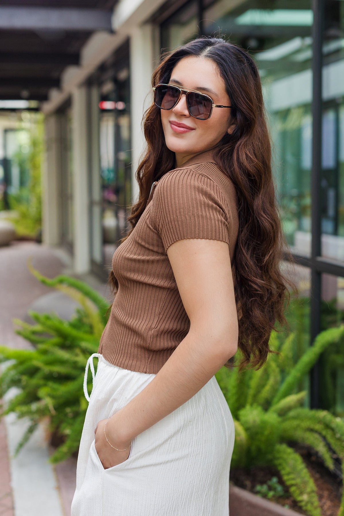 Tags: Brown Cropped Top, Zip Front Knit, Collared Summer Top, Sweater Knit Cropped Tee, Boutique Western Style, Metal Zipper Detail, Casual Chic, High-Waist Friendly Tops
