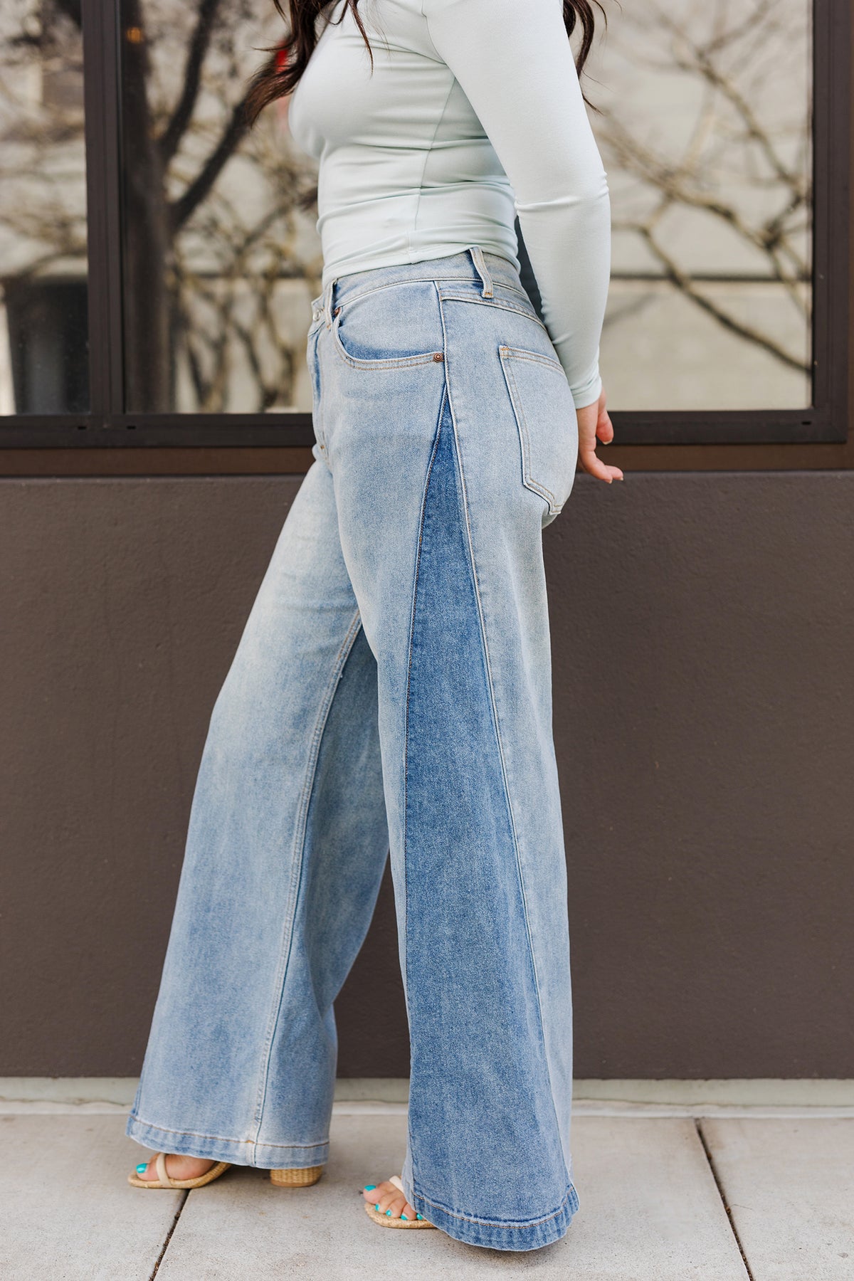 Whether you're running errands, heading to brunch, or dressing up for a night out, these wide leg jeans deliver effortless style with comfortable ease. The unique contrast stitching creates a fashion-forward focal point that sets these jeans apart, while the wide leg silhouette elongates your frame beautifully. The high-rise waist sits perfectly at your natural waist, creating a flattering, polished look that works with everything from simple tees to tucked-in blouses.
