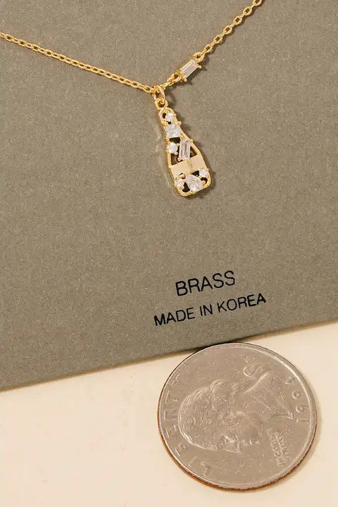 Add a touch of charm and sparkle to your look with The Cluster Pave Wine Bottle Pendant Necklace. Featuring a unique cluster pave wine bottle design, this elegant piece is perfect for wine lovers and fashion enthusiasts alike. Its shimmering finish and minimalist shape make it a statement accessory that transitions effortlessly from day to night. Whether you're dressing up for a night out or adding flair to your casual wear, this gold-tone necklace delivers both style and personality.