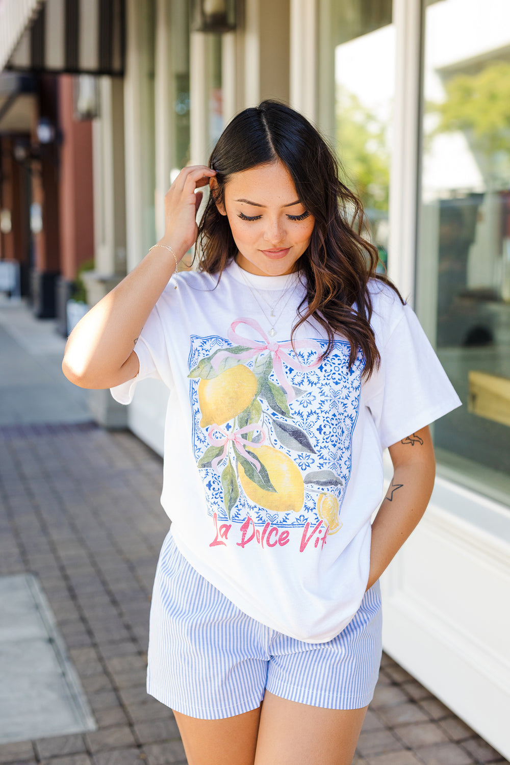 The Zest Coast Graphic Tee is serving sun-drenched sass and serious Amalfi energy. With a vintage-inspired lemon print, blue tile backdrop, and bold La Dolce Vita lettering, this tee is your wearable vacation—even if you’re just heading to brunch.