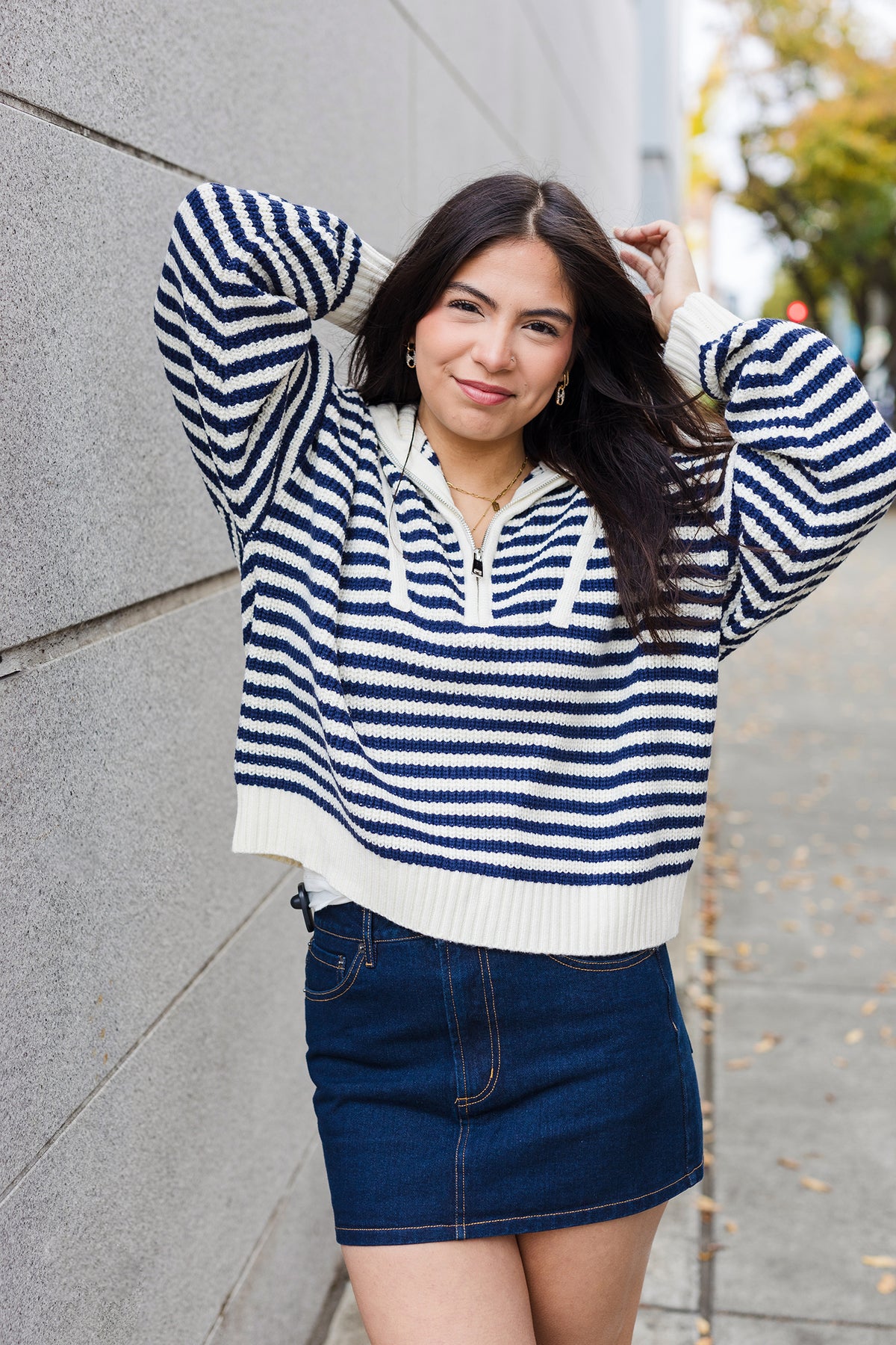 The Pacific Prep Half-Zip Striped Sweater brings classic West Coast style with a touch of modern polish. Featuring a chunky knit in contrasting stripes, this half-zip pullover pairs timeless prep with a relaxed, slightly cropped silhouette. The foldable collar and mock turtleneck add versatility—wear it zipped for cozy mornings or open for that breezy, beach-club feel.